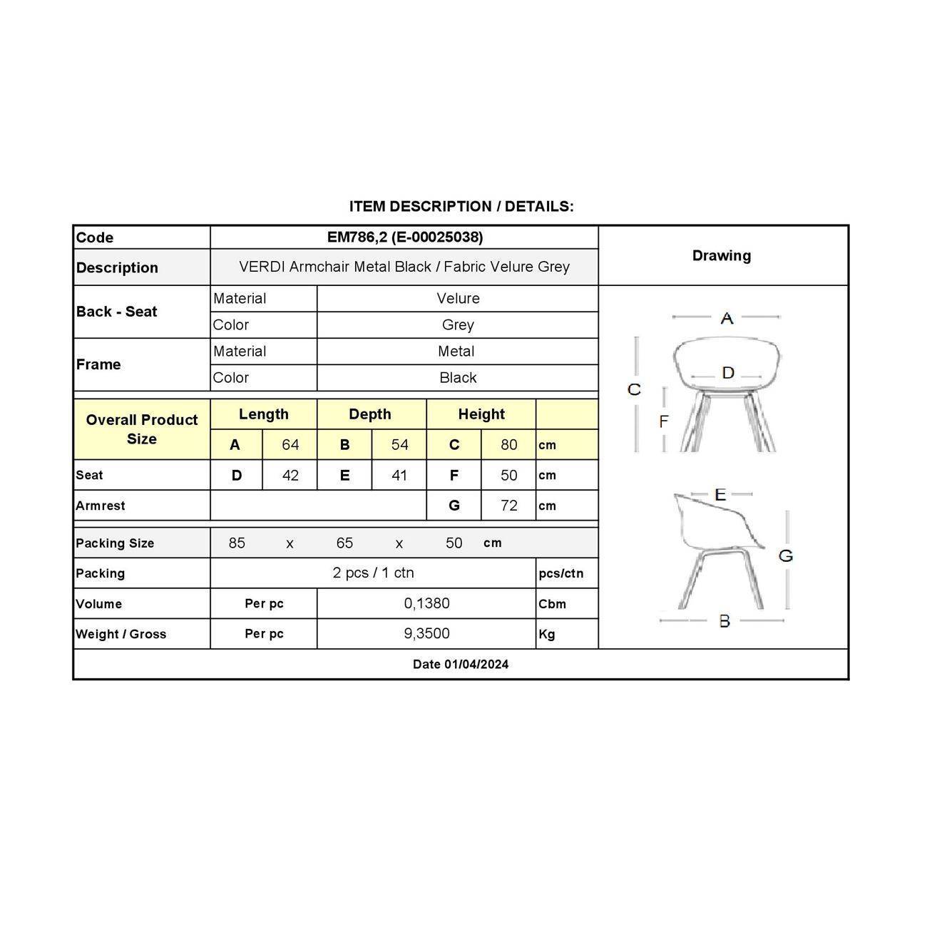 VERDI Πολυθρόνα Μέταλλο Βαφή Μαύρο, Ύφασμα Velure, Απόχρωση Γκρι Ε-00025038 ΕΜ786,2